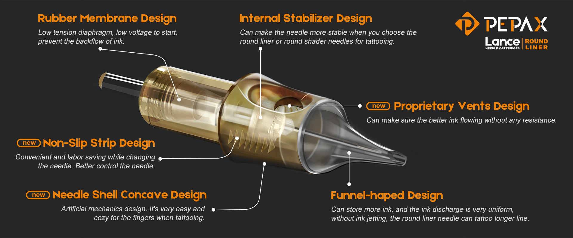 • Las agujas del cartucho PEPAX Lance son estables, el diseño del estabilizador interno de la aguja redonda puede hacer que la aguja sea más estable cuando está forrando.