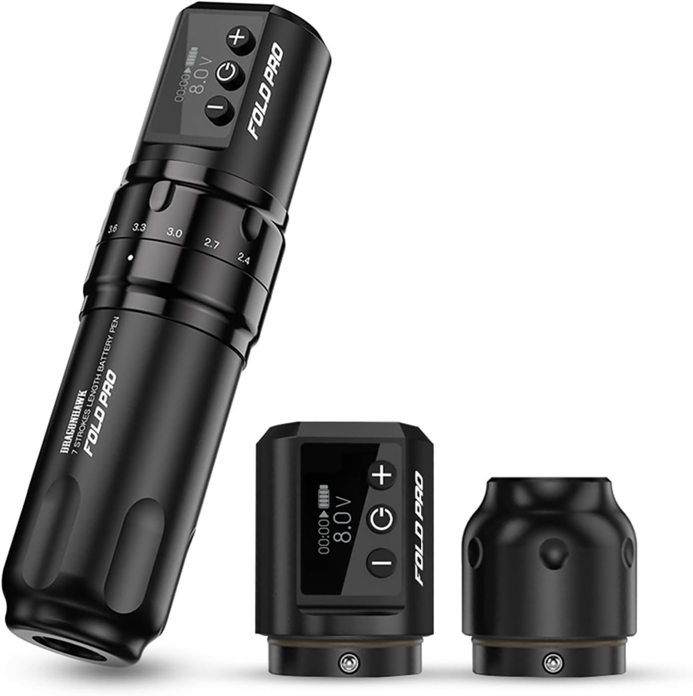 El pen inalámbrico Fold Pro de Dragonhawk es una máquina de tatuar muy versátil con una longitud de trazo ajustable con 7 longitudes preestablecidas entre 2,4 y 4,2 mm. Incluye una o dos baterías y un cable RCA, por lo que esta máquina se puede usar tanto con cable como de forma inalámbrica.
